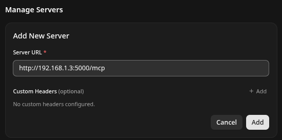 - Add New Server. Note /mcp is expected. Give it http://192.168.1.3:5000/mcp which we will get our python code to match.