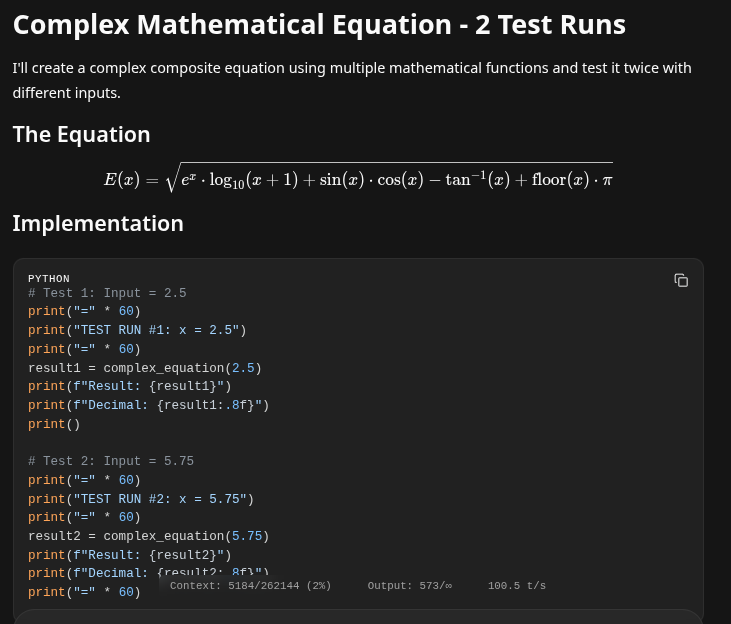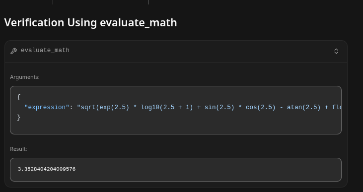 - Note it has created its own python function to test the equation, however it has no ability to do python (we will add that functionality next..)
