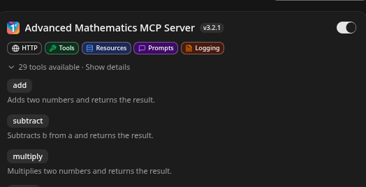 mcp = FastMCP(name="Advanced Mathematics MCP Server")Each individual function can simply be defined as - in this example we have defined the basic arithmetic: