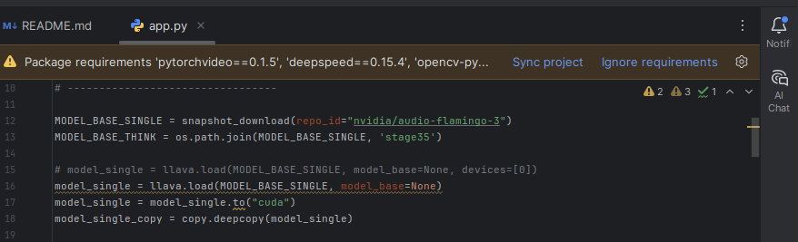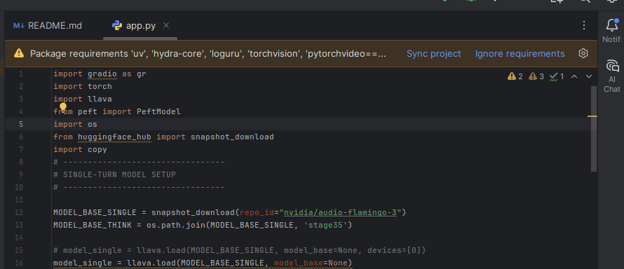 Verify Installation: Test basic inference with a provided script (e.g., llava/cli/infer_audio.py) or launch the Gradio demo from app.py in the chat space: