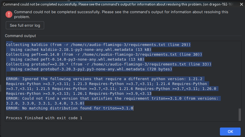 The error messages indicate compatibility issues between your Python 3.13 virtual environment and specific pinned dependencies in the requirements.txt file for the Audio Flamingo 3 project. Notably: