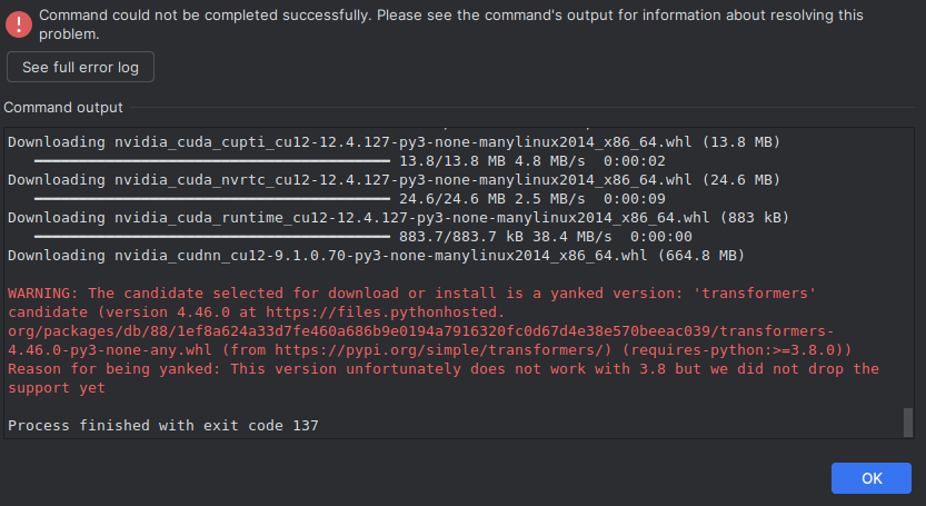To resolve this, recreate the virtual environment using Python 3.10, which aligns with the project's recommended configuration as specified in the repository's requirements.txt (pinned to Python 3.10.14). This version ensures compatibility with all dependencies while maintaining stability for CUDA-accelerated operations.