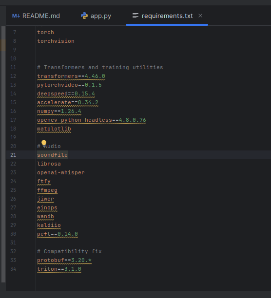 After this we tried running it, only to need more dependenices such as 'logru' and 'torchvision' on the third run we then installed 'soundfile' on the fourth run we needed 'librosa', then on the fifth try it needed 'whisper' then 'openai-whisper' Run 6 needed 'pytorchvideo