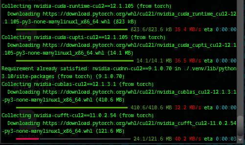 pip install torch torchvision torchaudio --index-url https://download.pytorch.org/whl/cu121Upon completion, verify the installations by checking the versions: