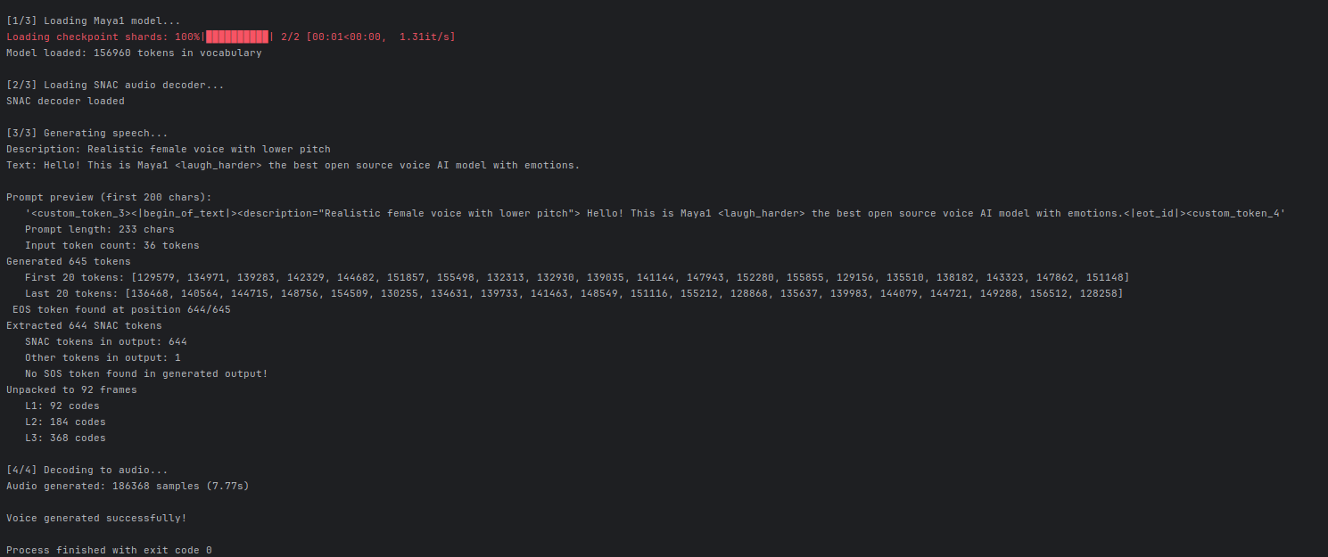 text = "Hello! This is Maya1 <laugh_harder> the best open source voice AI model with emotions."- It ran quickly and appreciably. We give this two-thumbs up for being very easy to run at the home front.