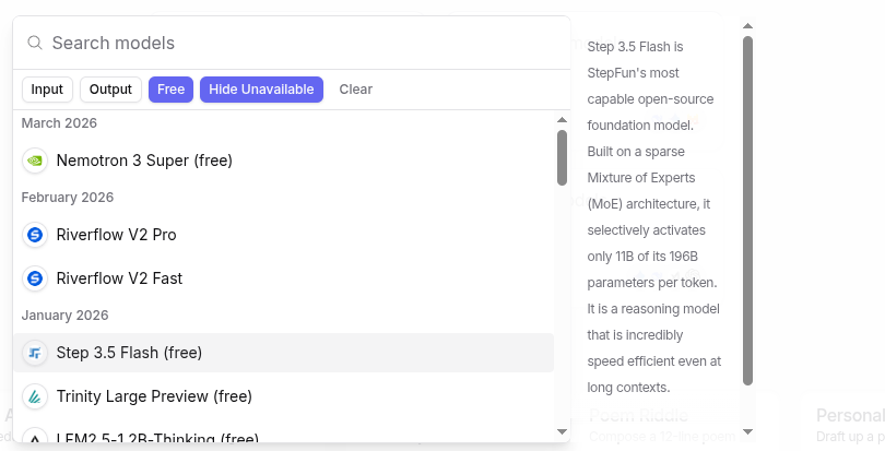 - Select Chat / Add LLM / Filter on Free.