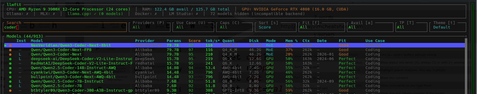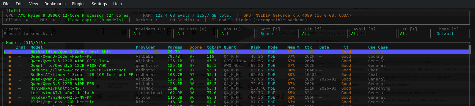 llmfitIt automatically lists all models that may fit your system, and the estimated number of tokens/s you may expect to obtain if you tried to local LLM them.