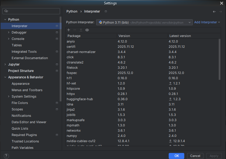 - Ctrl-Alt-S (Settings) migrate to pycharm / Interpreter, and you can see the current .venv