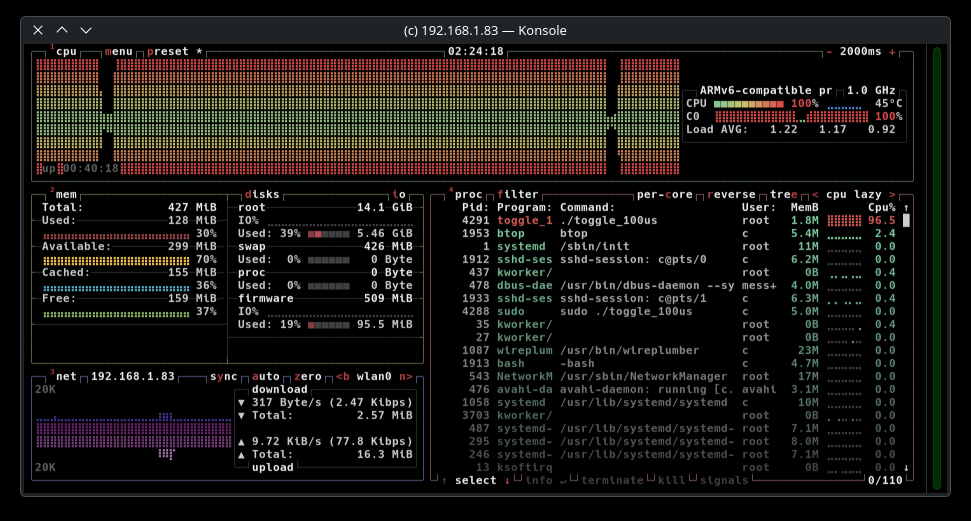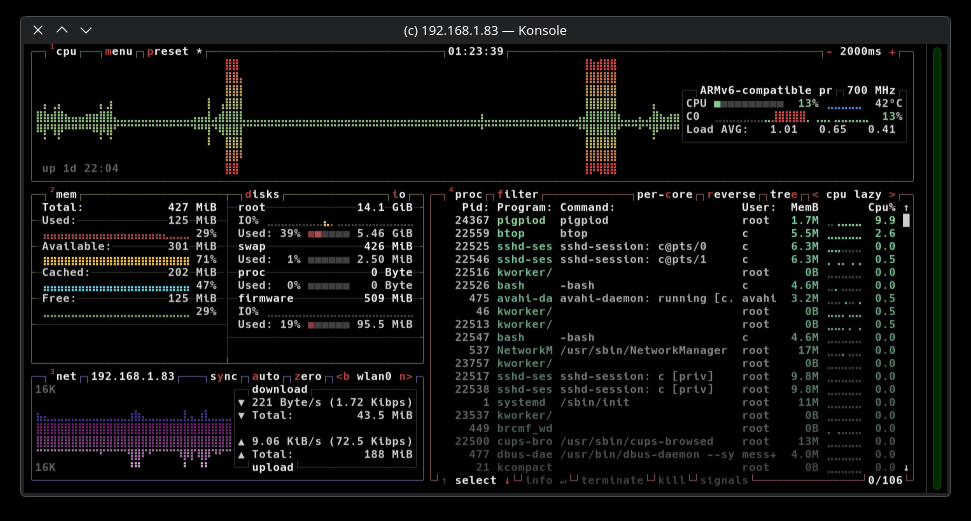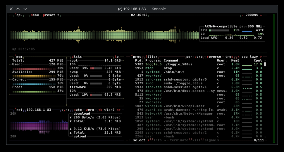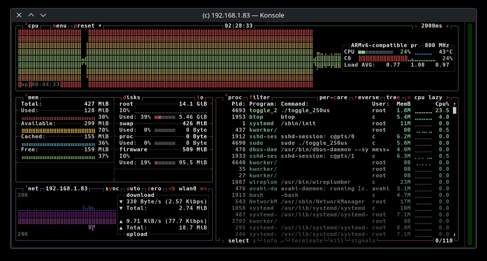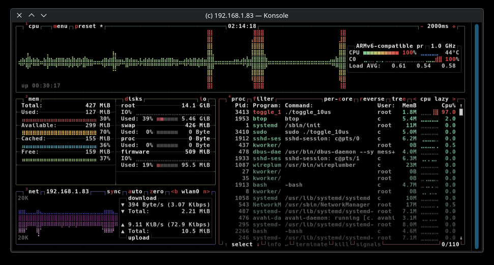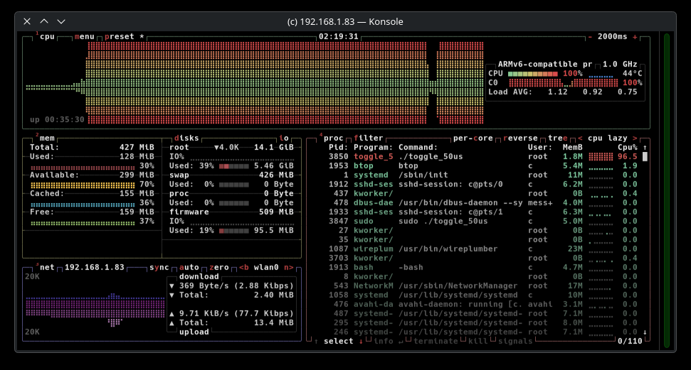 We noticed right away that when the pigpiod was started the cpu load on the Raspberry Pi Zero went from an idling 3% to about 12%, here is the btop screenshot